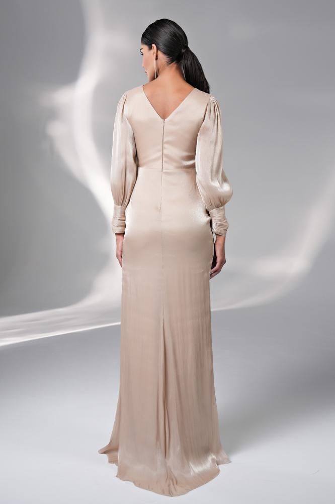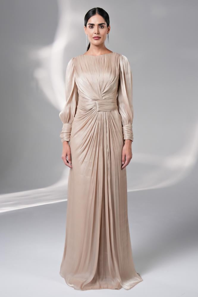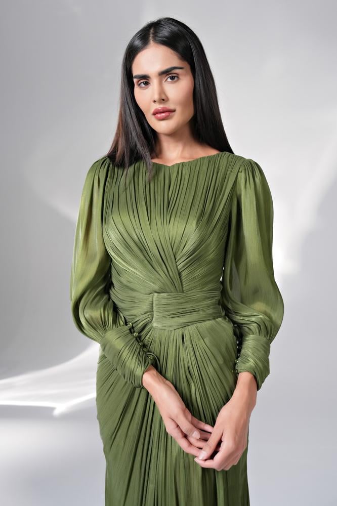 فستان سهرة بأكمام طويلة مثالي للمناسبات الفاخرة، يأتي بلون زيتي جذاب مع تفاصيل ذهبية أنيقة تضفي على التصميم لمسة من الفخامة والرقي. يتميز هذا الفستان بقصة مميزة تضبط شكل الجسم بشكل مثالي، مما يزيد من جاذبيتك في أي مناسبة ترتدينها.