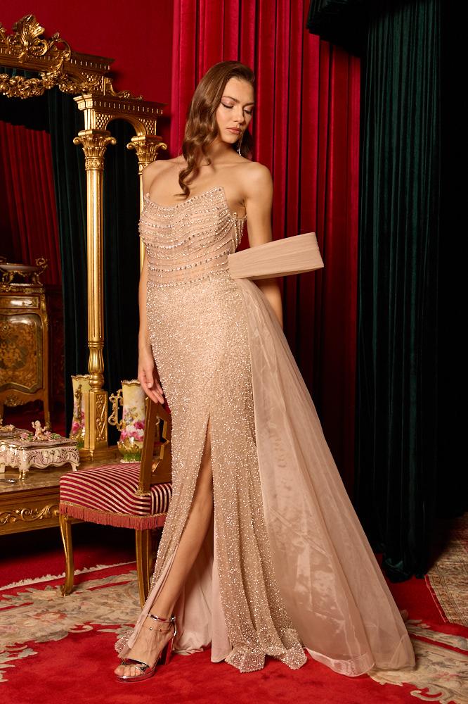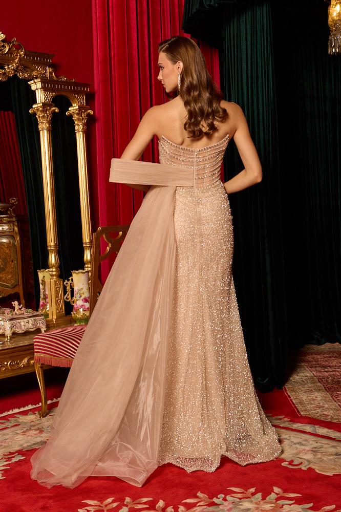 أختاري من مجموعة اكشن درس نيو كولكشن فستان سهرة توب من التل بفتح امامية وذيل جاني مطرز التطريز اليدوي بلؤلؤ وترتر ومزين الصدر بكسسوار سوارفسكي الإطلالة أكثر فخامة