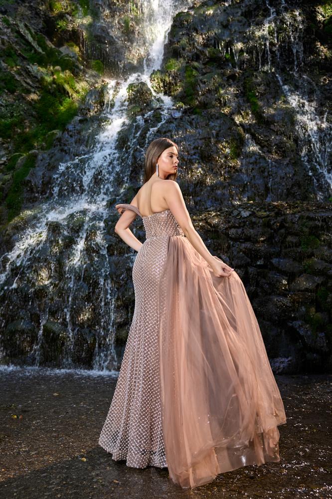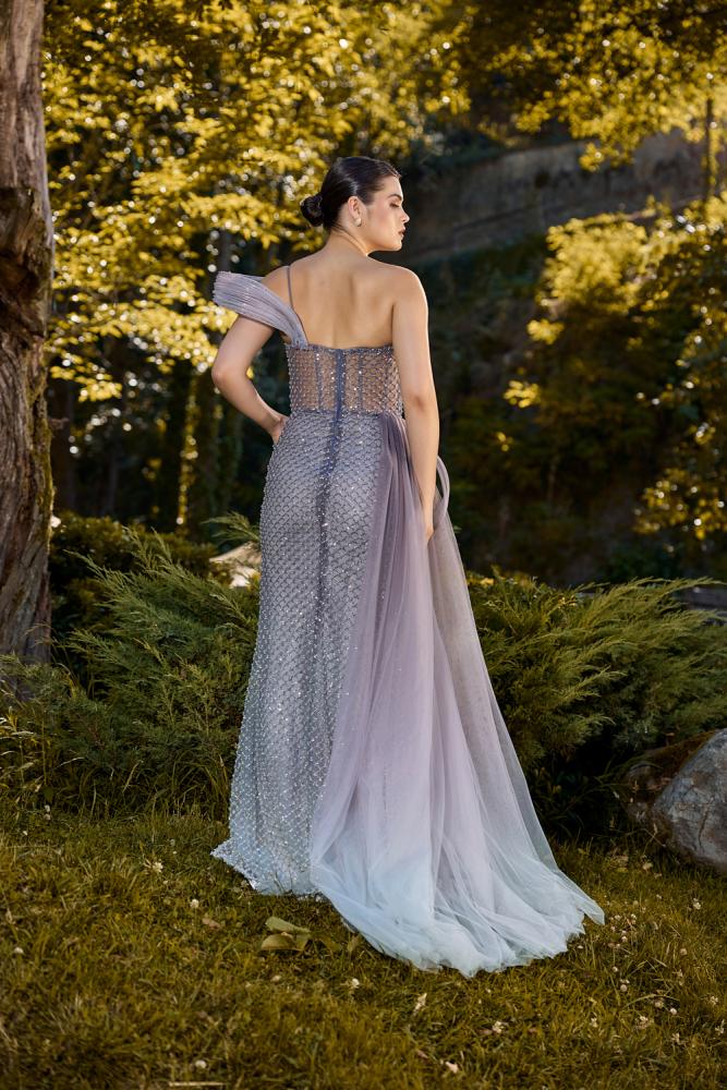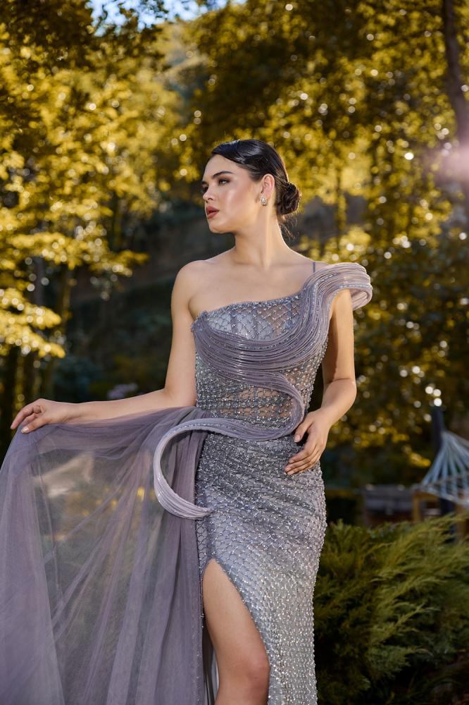 فستان تل فخم – إطلالة أنثوية جريئة بتطريز فاخر وفتحة ساق تخطف الأنظار!