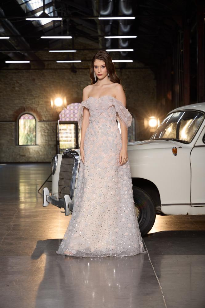 - فستان تول منفوش تصميم اوف شولدر يبرز الكتف والرقبة بشكل جذاب.