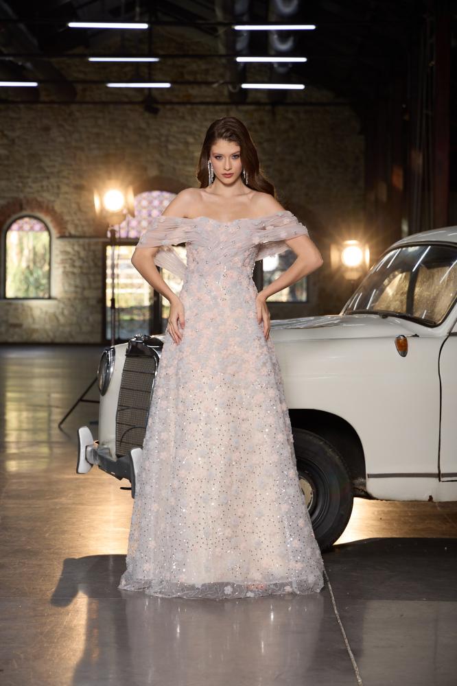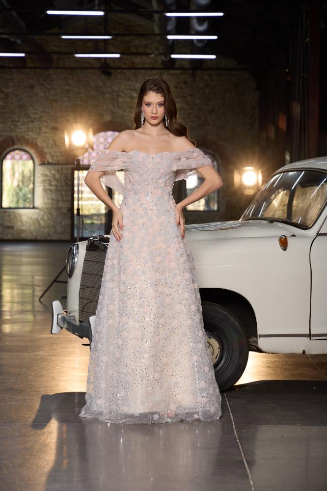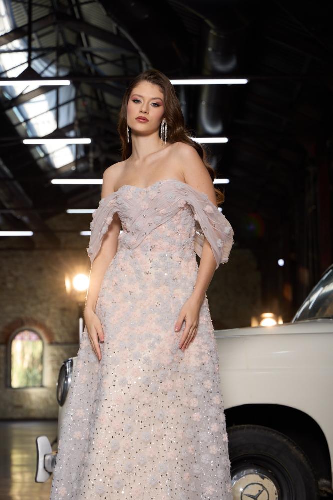 فستان تول منفوش للسهرة موديل 1011 يجي بلون بينك ناعم وتصميم أوف شولدر يبرز الأكتاف بجاذبية، مثالي للمناسبات اللي تبين فيها تطلين بإحساس أنثوي راقٍ وأنيق.